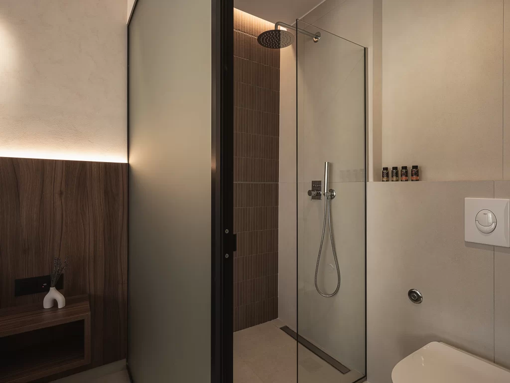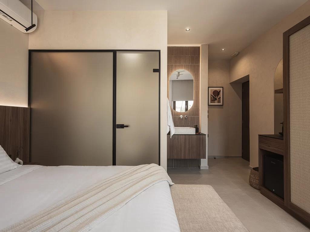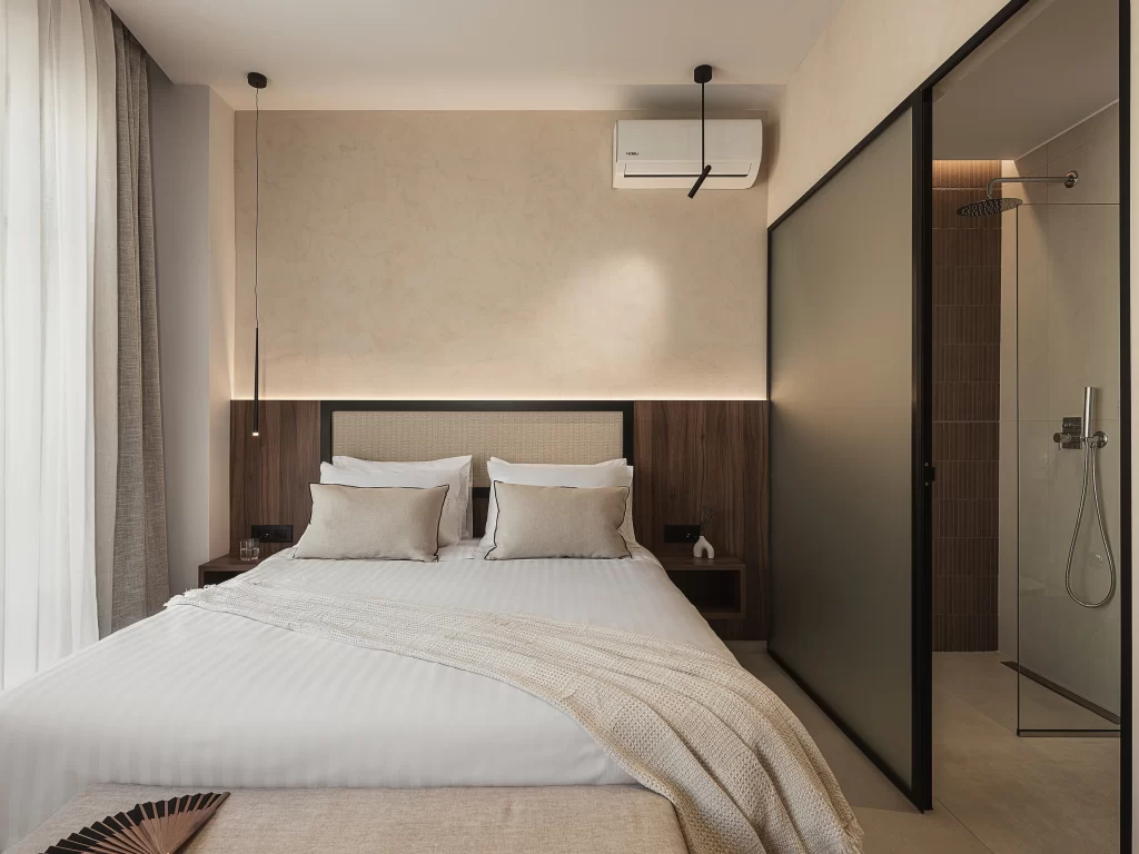 A modern and elegant room offers the ultimate comfort you need after a day of walking and exploring. Unwind in the sleek bathroom, featuring a walk-in shower. Step out onto your private balcony, sip your coffee, and soak in the true energy of the local area — the perfect way to relax and reconnect.