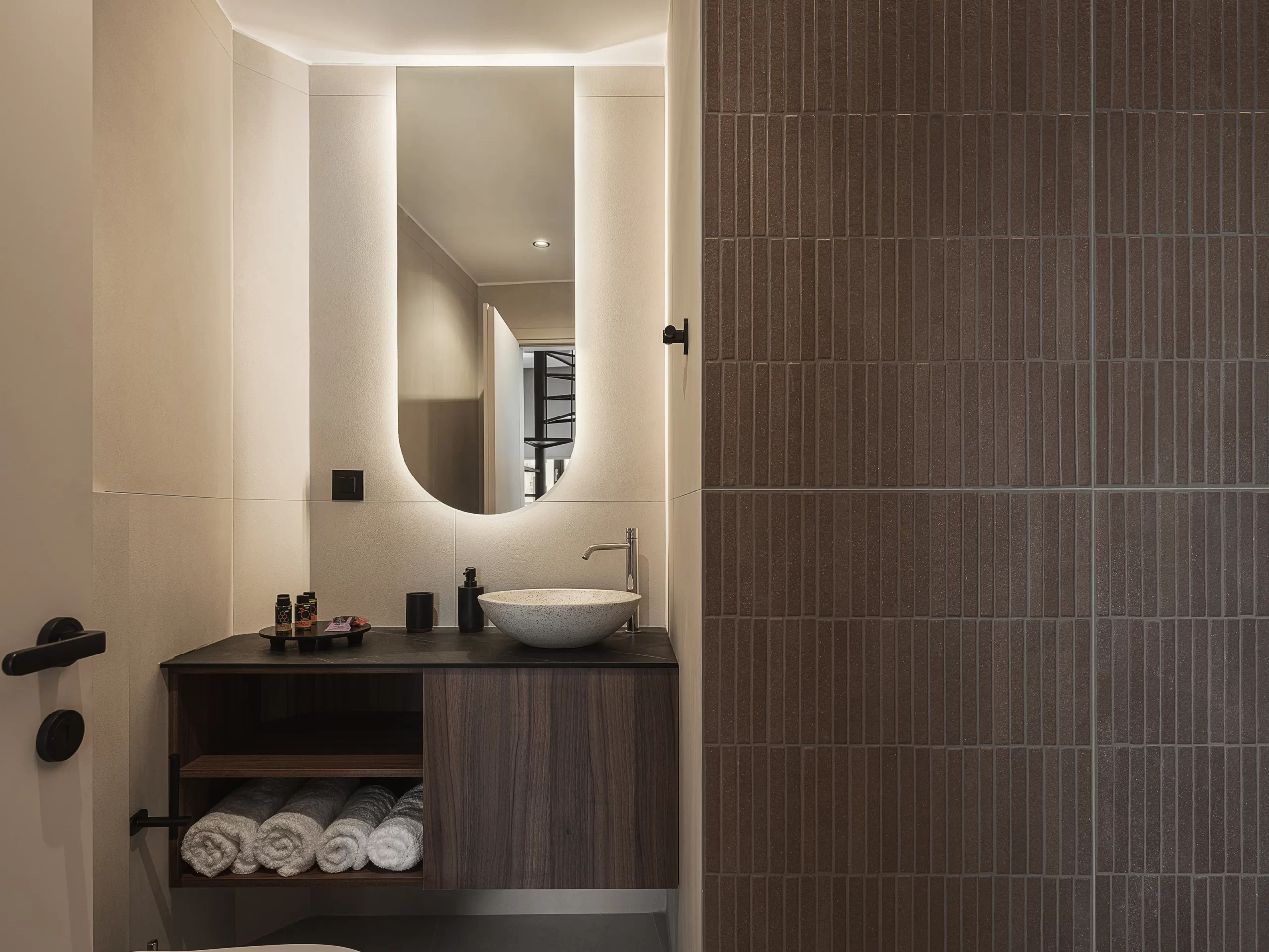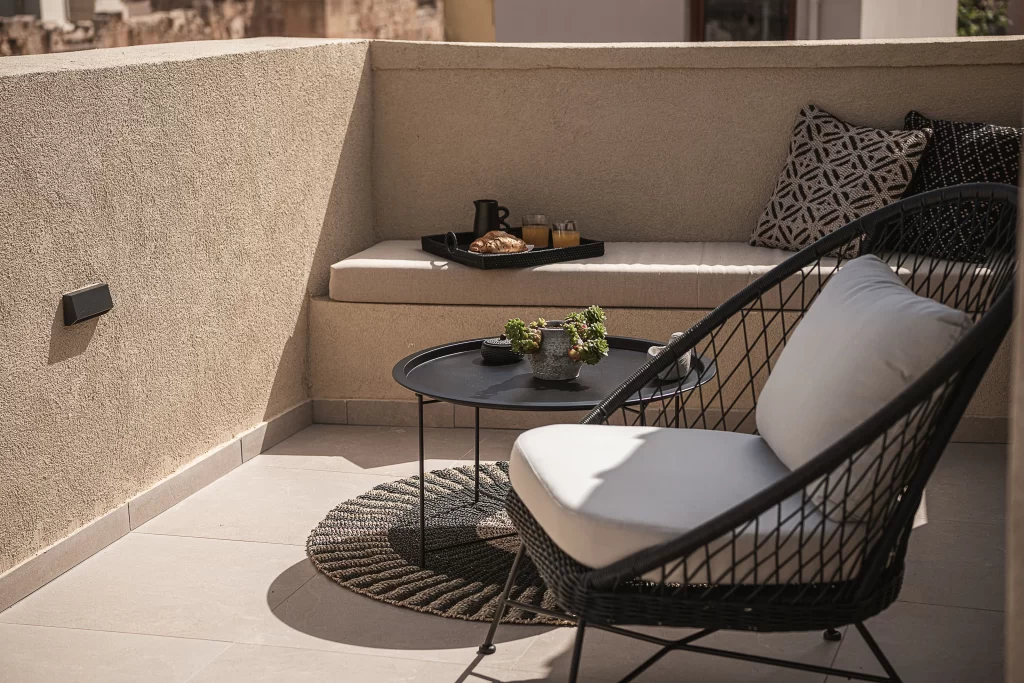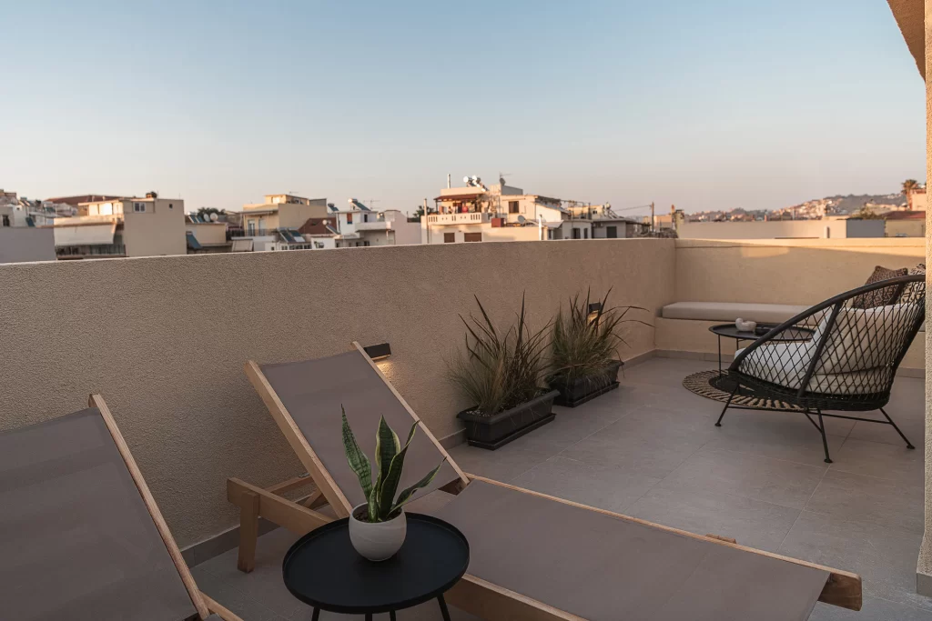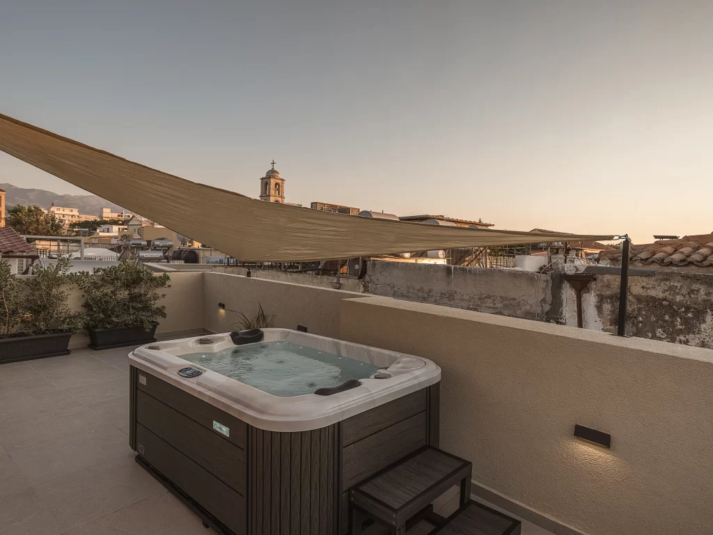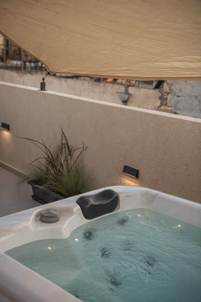 For those seeking a luxurious escape, our top-floor suite features a private outdoor jacuzzi and a stunning terrace with panoramic views of the city. Furnished with an outdoor lounge, sunbeds, and a second mini bar, this exclusive space is yours to enjoy — perfect for relaxing in the sun or watching the sunset in complete privacy. Inside, custom-designed furniture and modern lighting create an elegant, contemporary atmosphere.